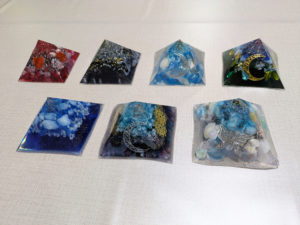 つやつや透明度の高いレジンで作るピラミッド型のオルゴナイト。インテリアとしてお守りとして使えるアイテムです。